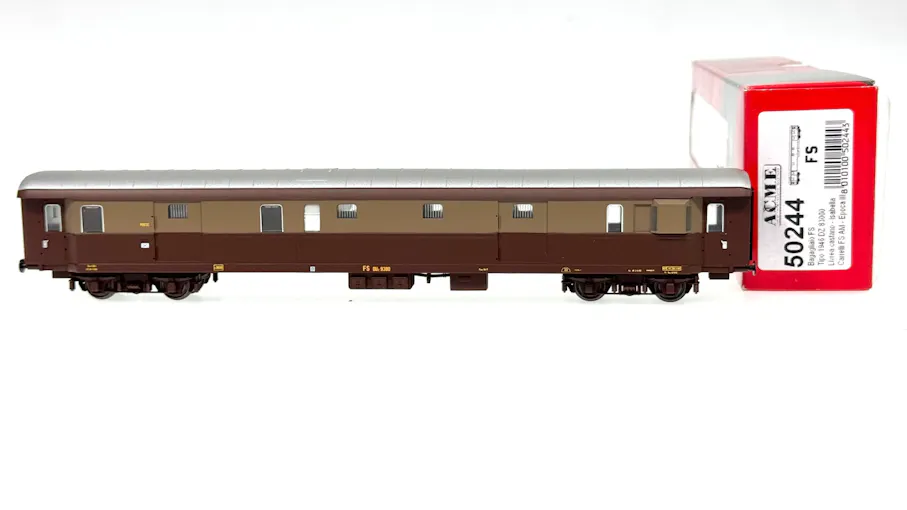 FS carrozza bagagliaio posta tipo Duz 83000 tipo 1946 livrea castano isabella con carrelli FS AM, ep.III