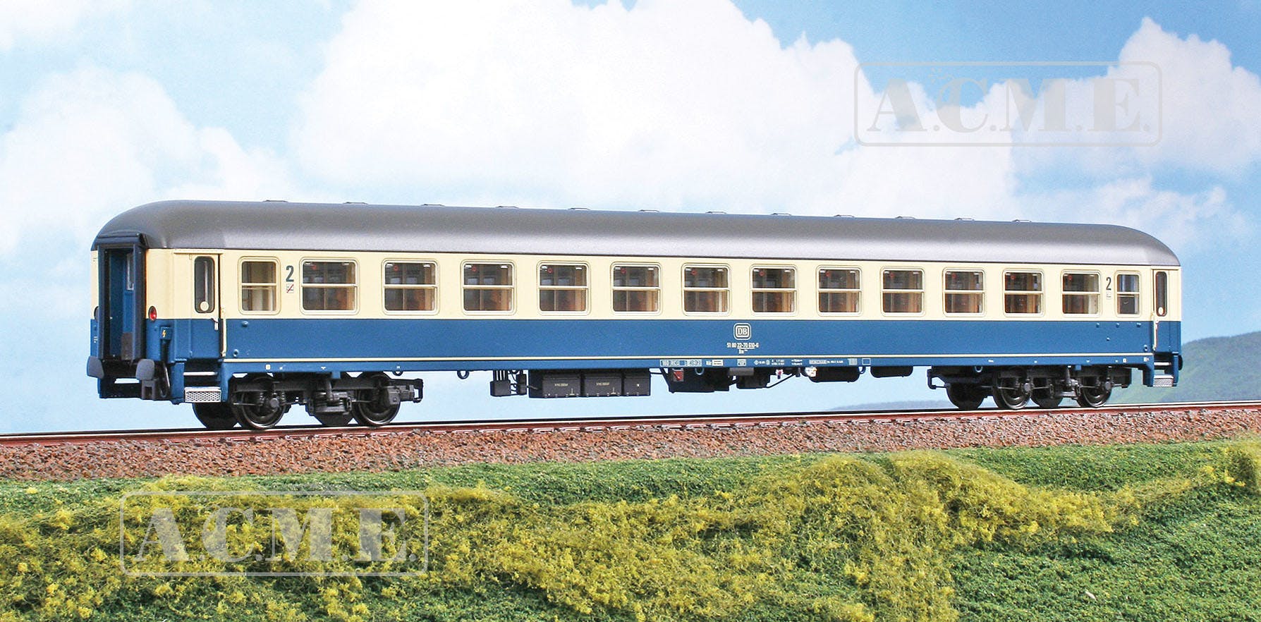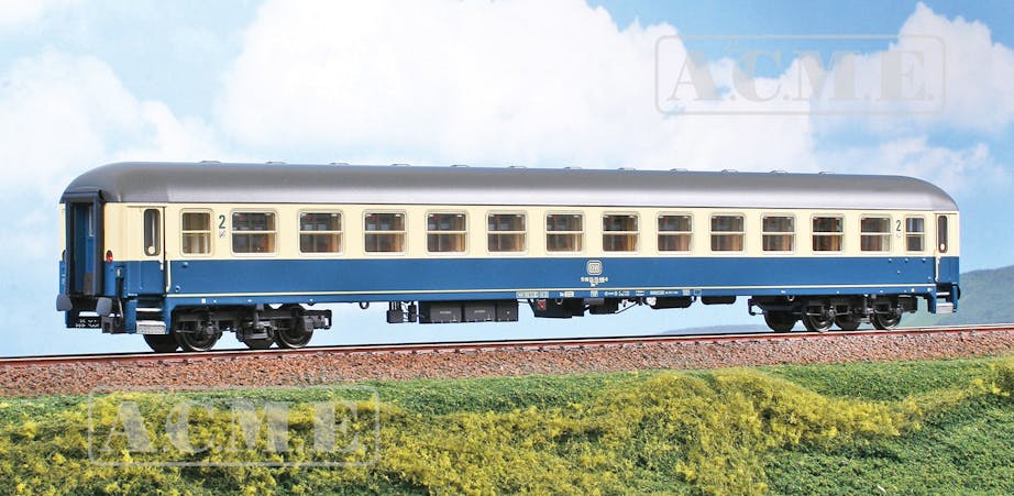Type X Bm234 second class DB car bleu/beige livery. UIC-X Wagen der DB, Epoche IV, Typ Bm234, ozeanblau/beige-Lackierung und graues Dach.
