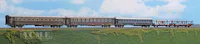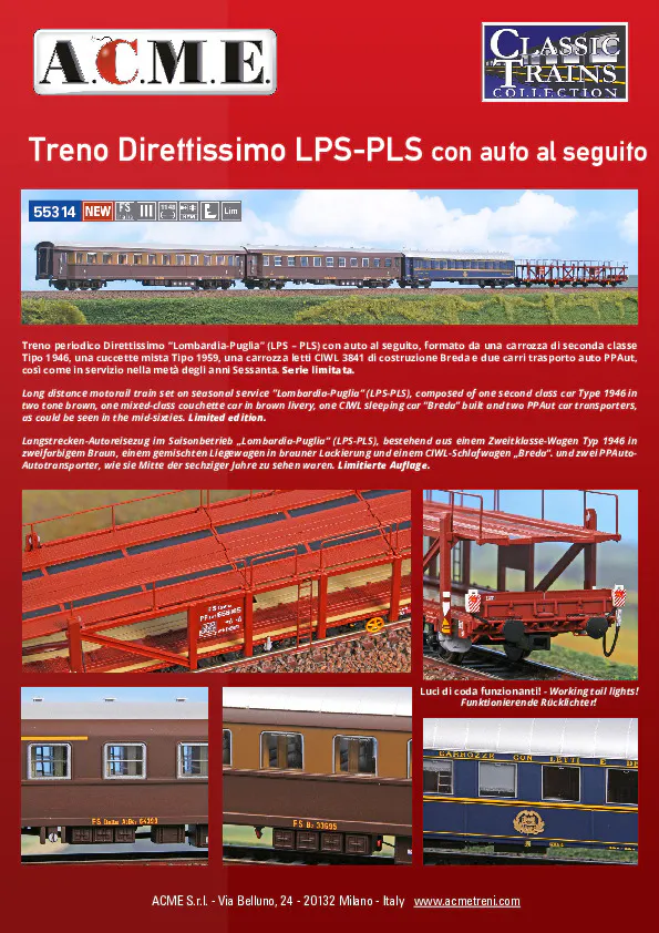 Long distance motorail train set on seasonal service ”Lombardia-Puglia” (LPS-PLS), composed of one second class car Type 1946 in two tone brown, one mixed-class couchette car in brown livery, one CIWL sleeping car “Breda" built and two PPAut car transporters, as could be seen in the mid-sixties. Limited edition. Working tail lights!