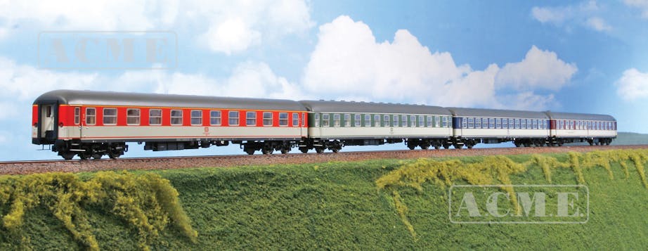 Set bestehend aus einem Am203-Wagen 1. Klasse, einem Büm239-Wagen 2. Klasse, einem Büm234-Wagen 2. Klasse und einem „Snack Bar“-Wagen BRbuümz285, alle in „Pop“-Lackierung