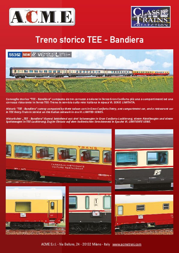 Historic “TEE - Bandiera” convoy composed by three saloon cars in Gran Conforto livery, one compartment car, and a restaurant car in TEE livery.Train in service on the Italian network in era VI.LIMITED SERIES.