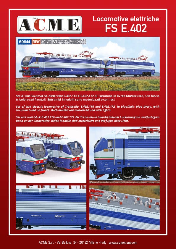 Set of two electric locomotive of Trenitalia, E.402.116 and E.402.172, in blue/light blue livery, with tricolour band on fronts. Both models are motorized and with lights.