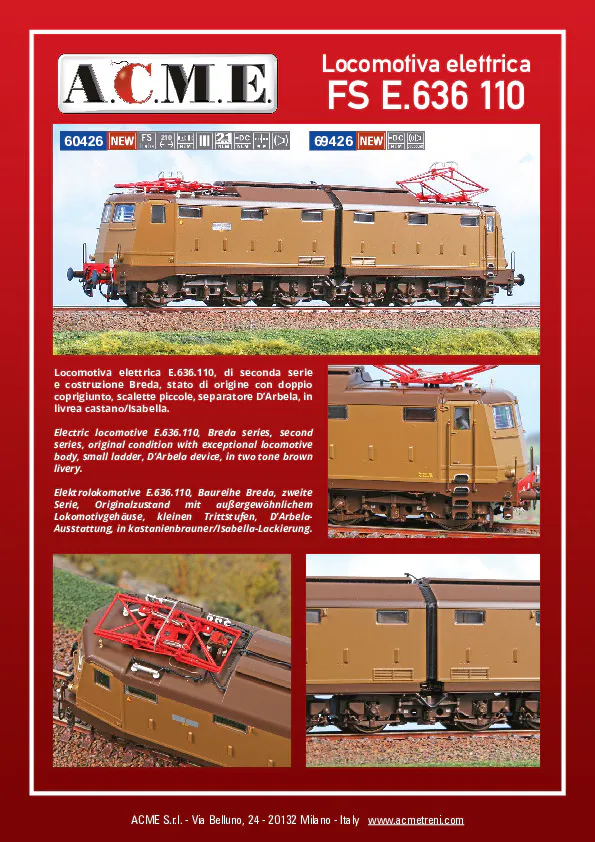 Electric locomotive E.636.110, second series and Breda construction, original status with double coupling cover, two tone brown livery.