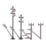 Pali elettrici da tetto Kit per 8 pali elettrici da tetto (2 x 4 forme diverse) per rappresentare l'alimentazione elettrica tramite un sistema di linee aeree. Adatto a tutti i tetti delle case. Vedi anche art. 1750 Cavo per linee aeree