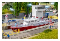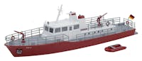Compatto e maneggevole, sempre pronto all'uso! Il modello della piccola nave antincendio rossa (modello a linea di galleggiamento, non galleggiante) è progettato principalmente per l'uso su vie navigabili interne e fiumi. Con il suo scafo appuntito e la timoneria dipinta di bianco, salpa verso la sua prossima missione. L'ampia superficie di carico offre spazio per diverse attrezzature antincendio ed è inclusa una scialuppa di salvataggio rossa coordinata.