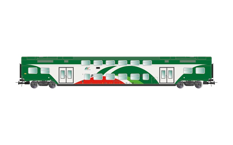 Trenitalia Tper, voiture Vivalto à 2 niveaux , toit rainuré, en livrée FER verte/blanche/rouge