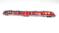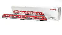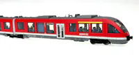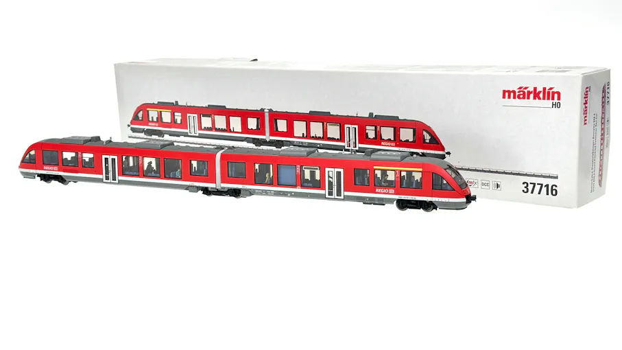 Modello: Il modello è dotato di decoder digitale mfx+ e di ampie funzioni sonore. Dispone inoltre di un sistema di propulsione ad alta efficienza controllato con volano montato sul carrello Jakobs. 2 assi motorizzati. Pneumatici di trazione. I tre fari anteriori e le 2 luci di posizione rosse cambiano in base al senso di marcia, funzionano sia in modalità convenzionale che digitale. I fari alle estremità motorizzate 2 e 1 del vagone possono essere spenti singolarmente. Il modello è dotato di illuminazione interna installata in fabbrica. Per i fari, le luci di posizione e l'illuminazione interna vengono utilizzati LED a luce bianca calda e rossa, esenti da manutenzione. Gli indicatori di destinazione sono fedeli al prototipo, con LED gialli. I fari, gli indicatori di destinazione e le luci interne funzionano sia in modalità convenzionale che digitale. Il telaio e la carrozzeria sono ben dettagliati. La visibilità attraverso i finestrini è nitida. Il modello presenta un diaframma chiuso e un meccanismo di guida sul carrello Jakobs tra le due metà dell'unità. Alle estremità del modello sono rappresentati i respingenti centrali. Lunghezza totale approssimativamente 48,1 cm