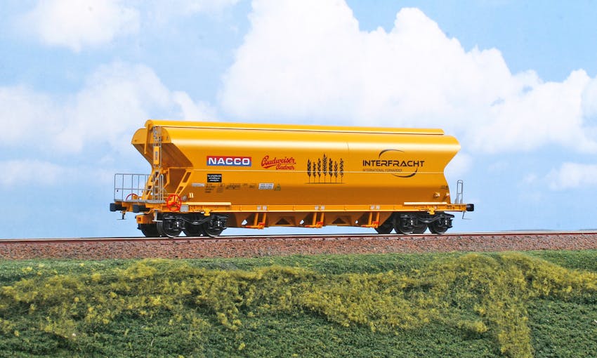 Carro tramoggia per trasporto cereali VTG-NACCO Tagnpps, con loghi “Budweiser” e “Interfracht”, ep.VI Scala H0 - 1/87