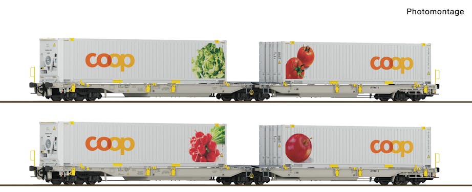 I moderni carri ferroviari T2000 di railCare, dotati di due container refrigerati da 45 piedi installati in modo fisso, sostituiscono i carri a pareti scorrevoli precedentemente utilizzati temporaneamente da FFS Cargo. Sono stati progettati appositamente per le operazioni di carico e scarico sulle rampe ferroviarie e offrono un elevato livello di praticità grazie al loro design sofisticato. Una piattaforma di carico in tre parti compensa la differenza di altezza rispetto alla rampa e consente quindi la massima flessibilità nelle operazioni di carico e scarico con i carrelli industriali. Con la loro vistosa scritta Coop, i vagoni caratterizzano oggi l'immagine del trasporto merci svizzero e circolano quasi quotidianamente in tutto il Paese.Grazie alla loro versatilità, possono essere utilizzati in un'ampia varietà di composizioni e lunghezze di treno. Le tre carrozze del modello formano già un treno prototipo che può essere utilizzato dietro le locomotive FFS Cargo e BLS Cargo e dietro il railCare Vectron "Coop". I treni T2000 puri, più lunghi, sono i cosiddetti "treni dell'acqua" che circolano tra Wangen bei Olten e Brig. A seconda della necessità, vengono regolarmente impiegate da 12 a 13 carrozze.