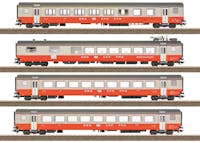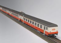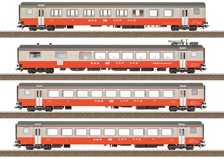 SBB CFF FFS set quattro carrozze passeggeri Swiss Express, ep.IV Quattro carrozze passeggeri unificate delle Ferrovie Federali Svizzere (SBB/CFF/FFS) di tipo Mark III. Una carrozza bagagliaio di 1a classe di tipo AD, una carrozza ristorante di tipo WR e due carrozze a sedere di 2a classe di tipo B. Colorazione di base grigio ciottolo/arancione sangue per lo Swiss Express. Percorso ferroviario: Ginevra–Losanna–Berna–Zurigo Stazione Centrale. Numeri di assegnazione carrozze 1, 13 e 14. Carrozza ristorante senza numero di assegnazione. Le carrozze presentano le condizioni di partenza del 1975.